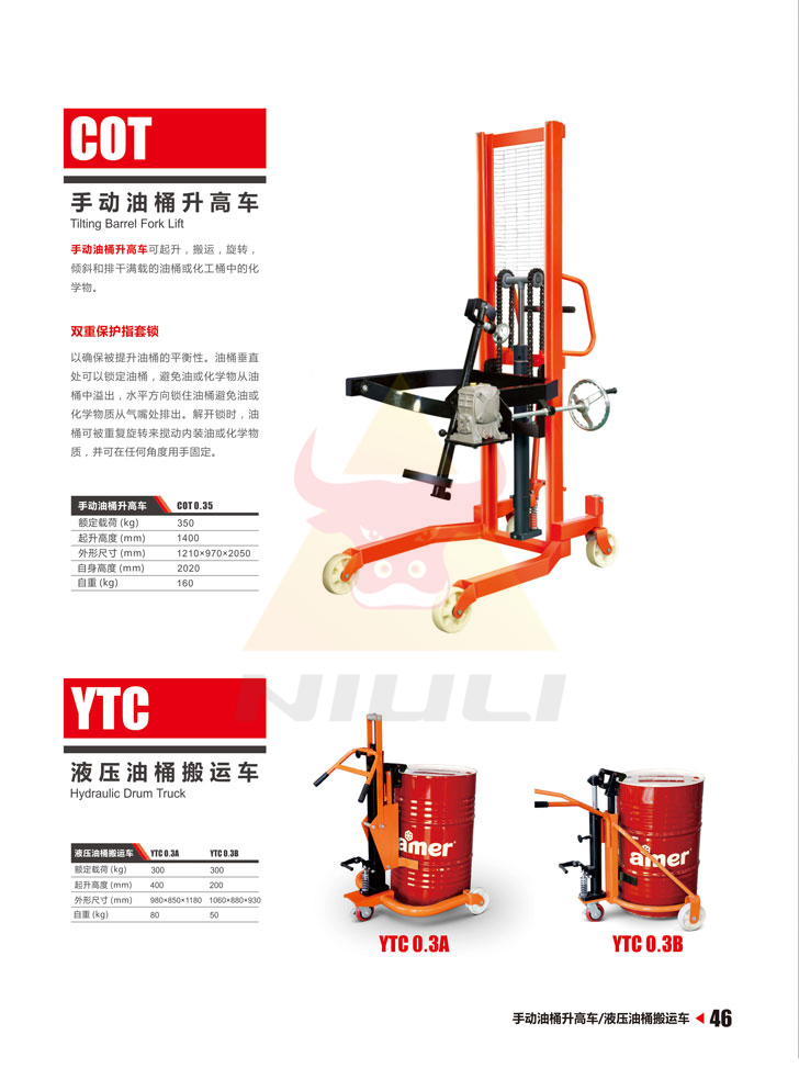 手動油桶升高車可起升,搬運,旋轉(zhuǎn),傾斜和排干滿載的油桶或化工桶中的化學物。雙重保護指套鎖以確保被提升油桶的平衡性。油桶垂直處可以鎖定油桶,避免油或化學物質(zhì)從油桶中溢出。