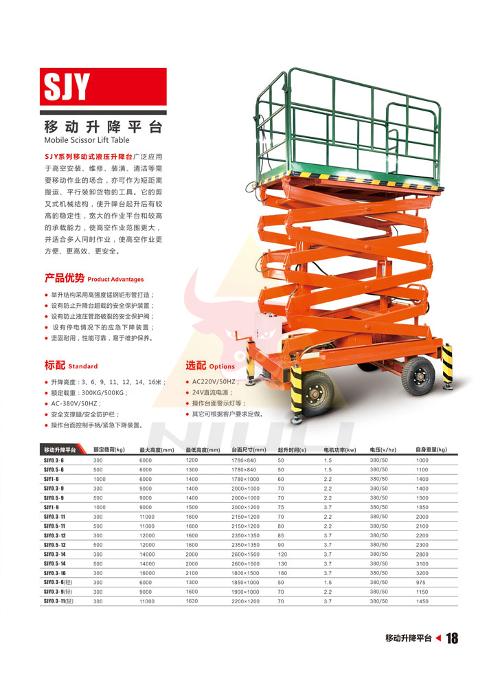 SJY系列移動式液壓升降臺廣泛應(yīng)用于高空安裝、維修、裝潢、清潔等需要移動作業(yè)的場合,亦可作為短距離搬運、平行裝卸貨物的工具。它的剪叉式機械結(jié)構(gòu),使高空作業(yè)更方便、更高效、更安全。