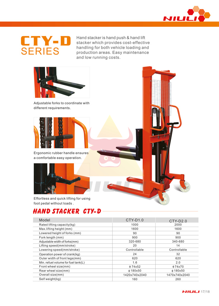 Hand stacker is hand push & hand lift stacker which provides cost-effective handling for both vehicle loading and production areas. Easy maintenance and low running costs.
